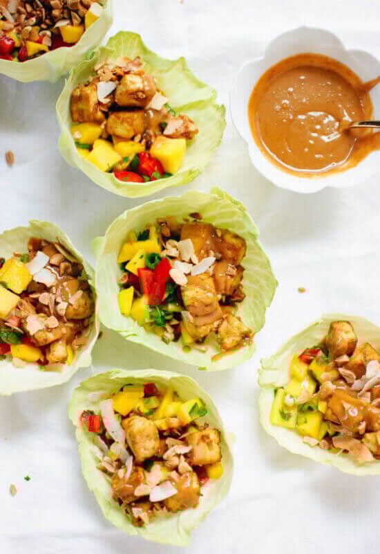 Thai Mango Cabbage Wraps with Crispy Tofu and Peanut Sauce