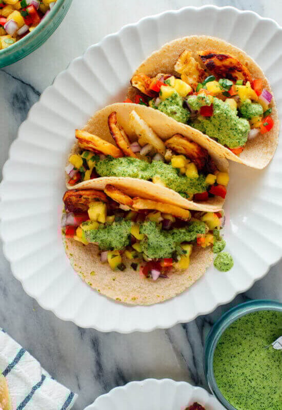 Halloumi Tacos with Pineapple Salsa & Aji Verde