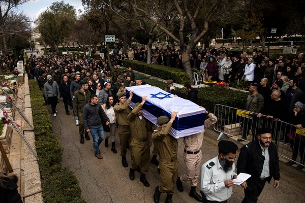 Family and friends mourn as they walk behind the coffin during the funeral of Sergeant major (res) Matan Lazar, killed in a battle in south Gaza on January 23, 2024 in Haifa, Israel.Amir Levy/Getty Images