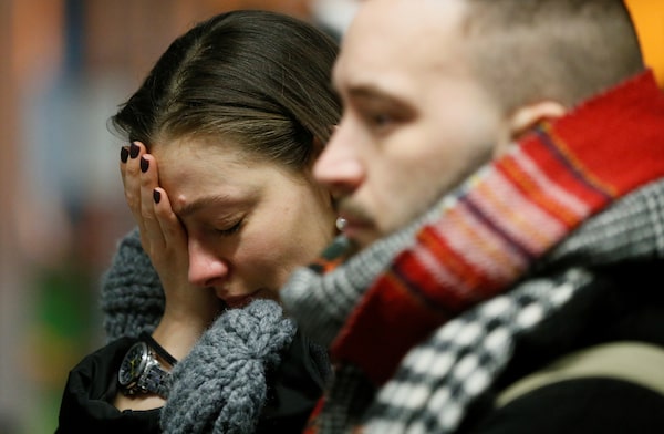 People react in front of a memorial for the flight crew members of the Ukraine International Airlines Boeing 737-800 plane that crashed in Iran, at the Boryspil International airport outside Kiev, Ukraine January 8, 2020.VALENTYN OGIRENKO/Reuters