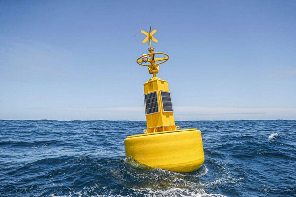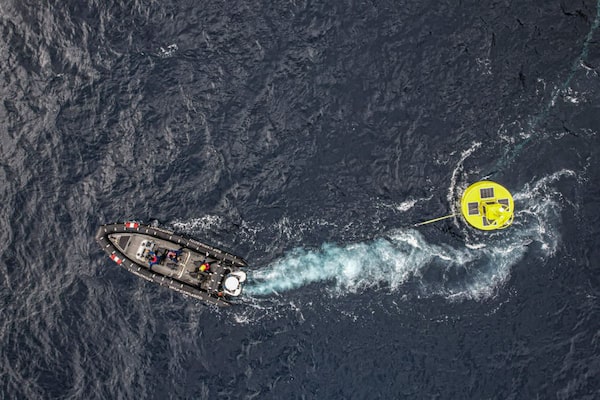 A Peruvian navy research ship deploys an El Niño monitoring buoy in the Pacific Ocean off Tumbes, near Peru's border with Ecuador, this past November.Supplied by ANDINA/AFP via Getty Images