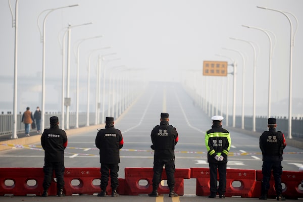 Police stand at a checkpoint on Jan. 31 last year at the Jiujiang Yangtze River Bridge between Hubei and Jiangxi province. Dramatic travel restrictions were a prominent and controversial part of China's early COVID-19 response.Thomas Peter/Reuters