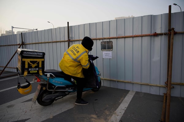 At the Beijing barricade, a delivery driver waits for customers to pick up their order.NOEL CELIS/AFP via Getty Images