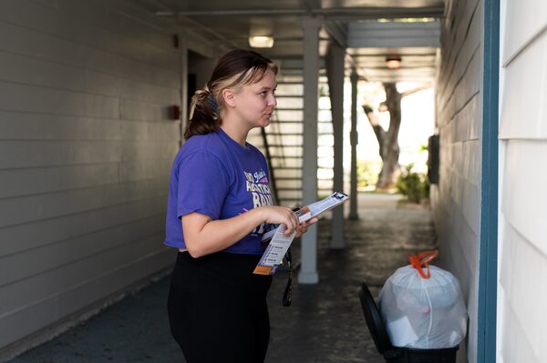 Sasha Hernandez knocks at the door of the first house on her canvassing route in Kissimmee, a city south of Orlando, on the blistering hot Friday afternoon. Anthony Martinez, a 60-year-old air-conditioning contractor, opens the door. He listens while Ms. Hernandez gives her spiel. Is he registered to vote? (He is.) What’s the biggest issue for him this election? (The economy.) What does he know about Amendment 4? (Not much, but he’s willing to listen.) “I don’t believe in abortion,” he says, but he thinks there should be exceptions for incest or to save the mother’s life.