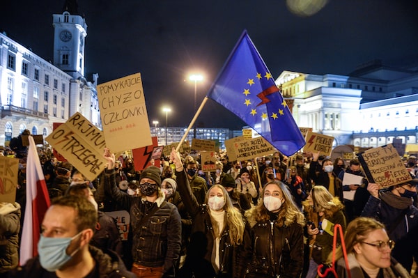 Organisers said some 100,000 people gathered in the capital, following a Constitutional Court ruling on Oct. 22 outlawing abortions due to fetal defects – ending the most common of the few legal grounds left for abortion in Poland and setting the country further apart from the European mainstream.