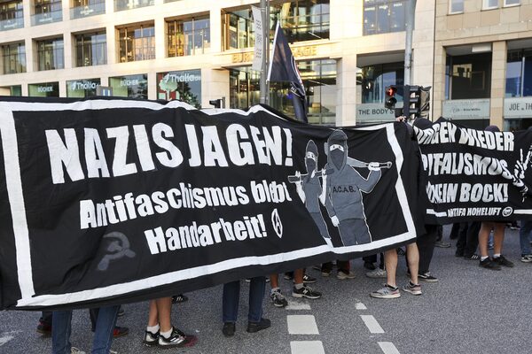 Participants in a demonstration against the right hold a banner with the slogan 'Hunt Nazis! Anti-fascism remains manual labour' in Hamburg, on Sept. 1.Bodo Marks/The Associated Press