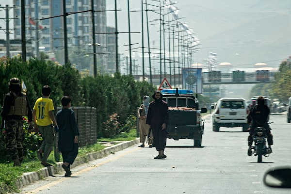 Taliban fighters stand guard along a road near the Russian embassy after a suicide attack in Kabul on Sept. 5.WAKIL KOHSAR/AFP/Getty Images