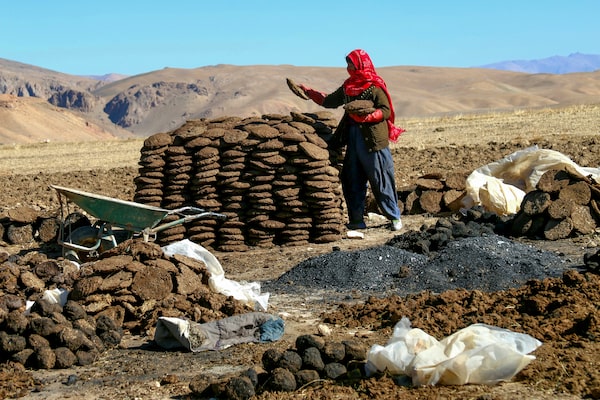 An Afghan woman stacks dried dung for fuel on the outskirts of Bamiyan province on Nov. 6.MOHAMMAD FAISAL NAWEED/AFP/Getty Images