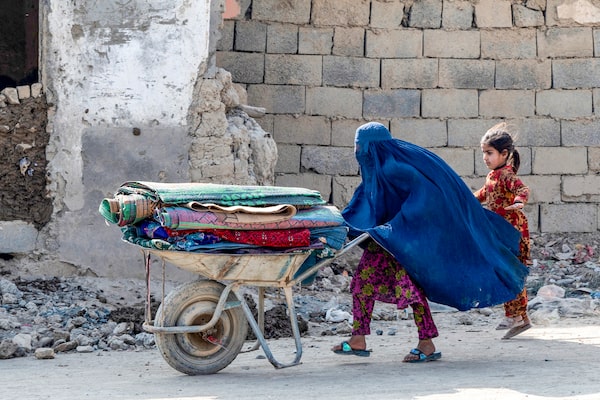 An Afghan girl wearing a mini burqa carries plastic mats on a wheelbarrow, along a street in Kabul on Nov. 11.WAKIL KOHSAR/AFP/Getty Images