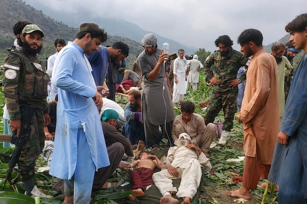 Civil defense workers, locals and army soldiers on Monday prepare to evacuate injured victims of an earthquake that killed hundreds and destroyed numerous villages in eastern Afghanistan.Hedayat Shah/The Associated Press