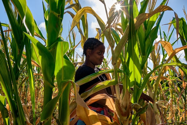 Ladias Konje, a communal farmer, walks through her wilting maize field, which suffered from moisture stress at tasseling during a long mid-season dry spell, in the Kanyemba village in Rushinga, Zimbabwe, on March 3.JEKESAI NJIKIZANA/Getty Images