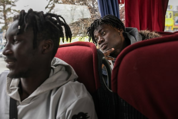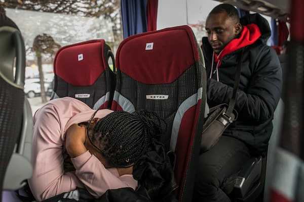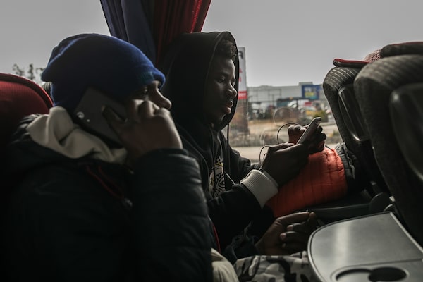 A bus load of around 20 Ukrainian refugees from Africa, Bangladesh and India sit on a bus in the Polish city Przemysl headed for Warsaw.Anna Liminowicz/The Globe and Mail