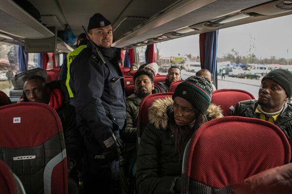 Even though Polish officials were more welcoming than their Ukrainian counterparts to the foreigners at the border, the reception in Przemysl wasn’t entirely hospitable. It wasn’t clear why only men from non-European countries were on the bus to Warsaw, and they had no idea where in the city they were being taken.