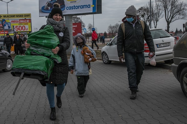 John Okwuwa and his daughter Judy, who are from Nigeria, arrive in Przemysl, Poland, after crossing the border from Ukraine on Feb. 27.Anna Liminowicz/The Globe and Mail