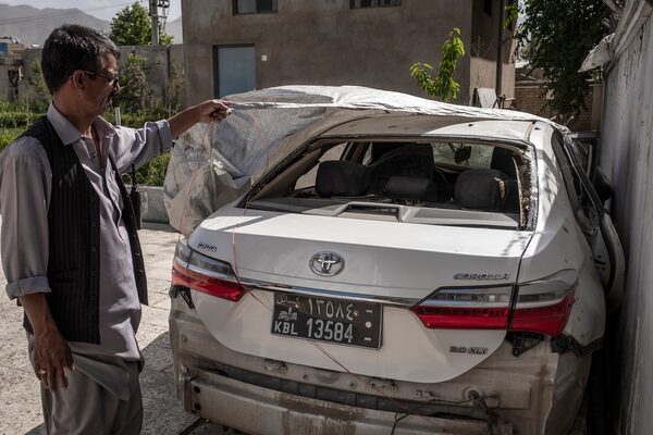 The car in which Fatima Khalil, a human rights worker, and her driver, Ahmad Jawid Folad, were killed, in Kabul on June 28. Khalil joins a long list of young Afghans who died trying to help their country.JIM HUYLEBROEK/The New York Times News Service