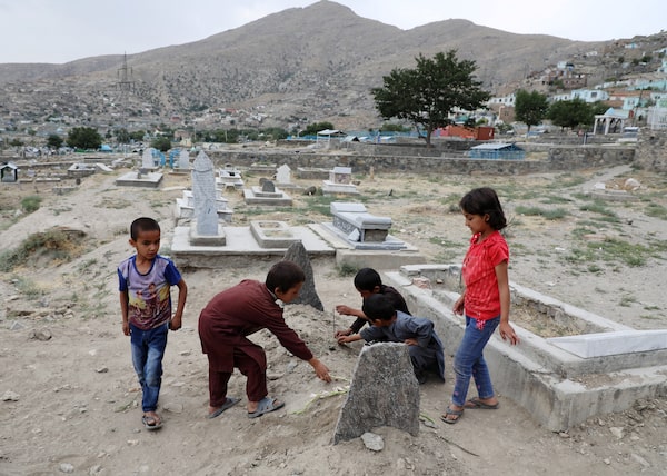 Children put flowers over the grave of twenty-four-year old Fatima Khalil, known as 'Natasha', who was killed in a bomb blast on Saturday, in Kabul on June 30.OMAR SOBHANI/Reuters