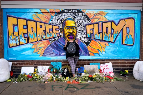 A woman pays respect to George Floyd at a mural at George Floyd Square in Minneapolis, Minn., on April 23, 2021.Julio Cortez/The Associated Press