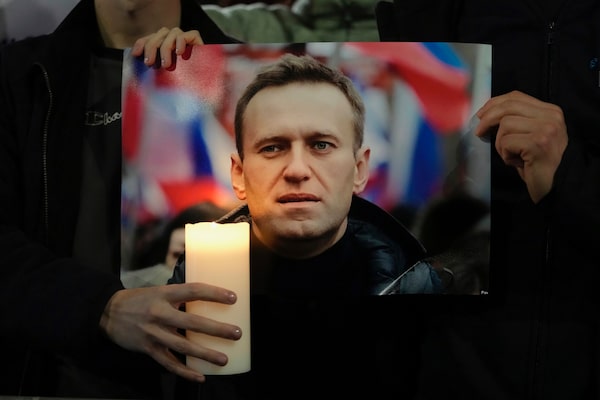 Protesters hold a picture of Alexey Navalny as they stage a demonstration opposite the Russian Embassy in London, on Feb. 16, in reaction to the news that the jailed Russian opposition leader has died in a Russian prison, according to the Federal Penitentiary Service.Kin Cheung/The Associated Press