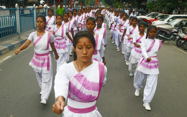 In Silguri, female RSS volunteers take part in a procession to mark the end of their training. The RSS is the parent organization of Mr. Modi's ruling BJP party.DIPTENDU DUTTA/AFP/Getty Images
