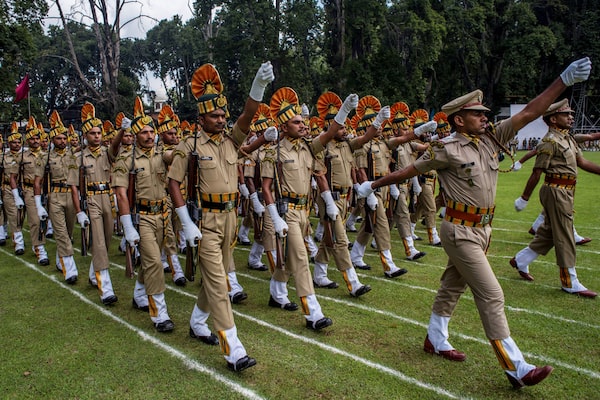 Indian paramilitary troopers march at Srinagar's Sher-i-Kashmir stadium on Independence Day, marking the end of British rule in India. Pakistan's independence day is a day earlier.Yawar Nazir/Getty Images