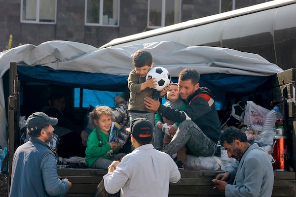 Ethnic Armenian family from Nagorno-Karabakh are helped to leave a truck with their belongings after arriving to Armenia's Goris in Syunik region, Armenia, on Sept. 30, 2023.Vasily Krestyaninov/The Associated Press