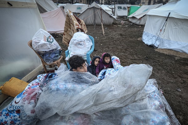 Young Palestinians sit outside on mattresses covered with plastic at a camp for displaced people in Rafah, on Dec. 13.MAHMUD HAMS/Getty Images