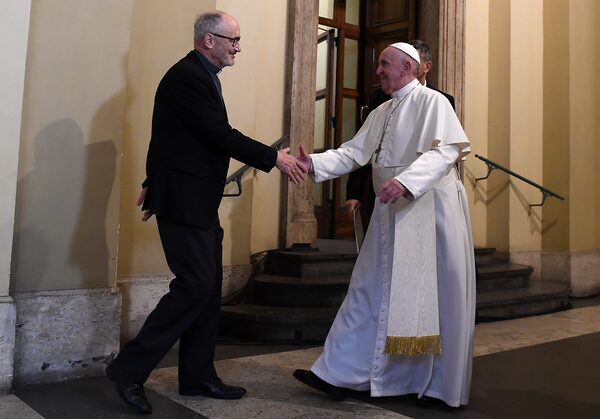 Pope Francis, right, shakes hands with Canadian Cardinal Michael Czerny at a 2019 meeting.ETTORE FERRARI/AFP