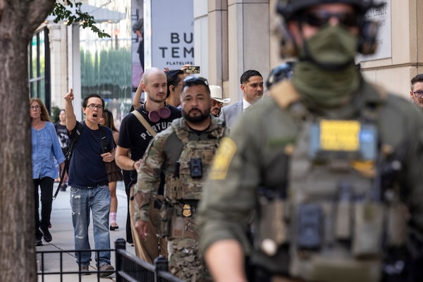 Pedestrians chant "ICE go home!" as federal immigration agents walk along North Clark Street in Chicago, Ill., on Sept. 28.Ashlee Rezin/The Associated Press