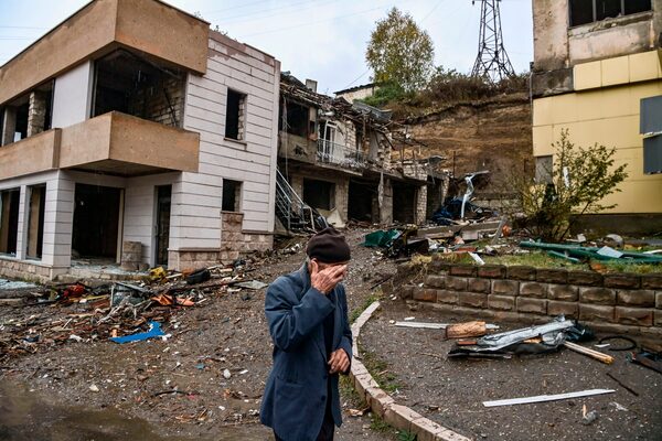 Stepanakert, Oct. 6: An elderly man walks past destroyed buildings in the main city of the breakaway Nagorno-Karabakh region, the subject of ongoing fighting between Armenia and Azerbaijan.ARIS MESSINIS/AFP via Getty Images/AFP/Getty Images