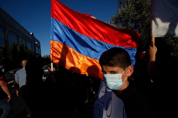 A boy stands by an Armenian flag during a demonstration in support of Armenia outside of the U.S. embassy in the Cypriot capital, Nicosia, on Sept. 30.Petros Karadjias/The Associated Press/The Associated Press