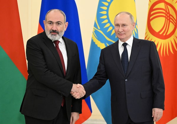 Russian President Vladimir Putin shakes hands with Armenian Prime Minister Nikol Pashinyan during a meeting of the Supreme Eurasian Economic Council in Saint Petersburg, Russia, on Dec. 25.SPUTNIK/Reuters