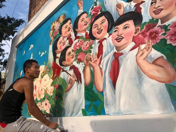 In Caochangdi, an art district in a northeast corner of Beijing, Zhang Lei has been painting cherub-faced schoolchildren on a wall. Pictures like it were a common theme of party propaganda in the 1970s and 80s. One child holds a red flag painted with the word “peace.” Doves flit in the background. “It lets people remember happy times,” said Yang Jingyu, Mr. Zhang’s wife.