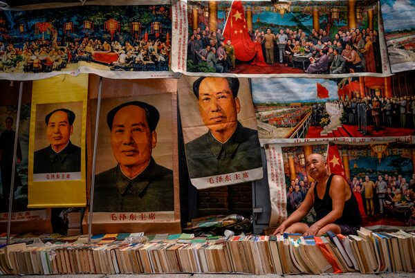 This Sept. 7, 2019 photo shows a vendor of books and souvenirs - some featuring Mao Zedong - waiting for customers at the Panjiayuan Antique Market in Beijing.NOEL CELIS/AFP/Getty Images