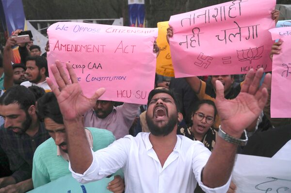 Indian Hyderabad Central University students protest a new citizenship law in Hyderabad, India, on Dec. 16, 2019.Mahesh Kumar A/The Associated Press