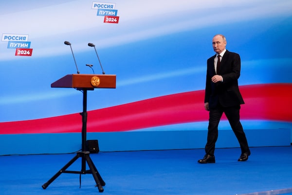 Vladimir Putin arrives to speak after polling stations closed on the final day of the presidential election, in Moscow, Russia, on March 17.Maxim Shemetov/Reuters