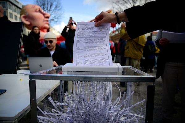 A protester feeds an election ballot into a shredder machine during a performance in front of the Russian embassy in Berlin, where voters lined up to cast their ballots in the Russia's presidential election on March 17.TOBIAS SCHWARZ/Getty Images