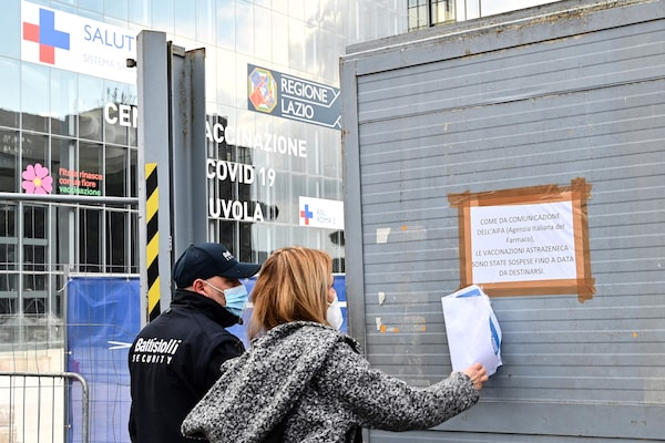 Employees of the Lazio Region stick a placard reading 'as said by the Italian Medicines Agency the AstraZeneca vaccinations have been suspended until a later date' at the entrance to a new vaccination centre in Rome on March 16, 2021.ANDREAS SOLARO/AFP/Getty Images