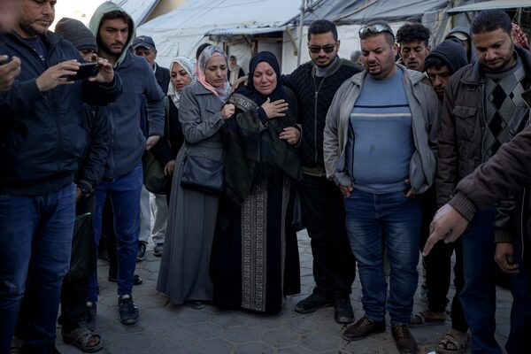 Palestinians react next to the bodies of their relatives who were killed in the Israeli bombardment of the Gaza Strip at Al-Aqsa Hospital in Deir Al-Balah, on Dec. 25.Abdel Kareem Hana/The Associated Press