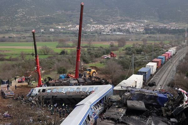 Rescuers operate at the site where two trains collided near the city of Larissa, Greece, March 1, 2023.ALEXANDROS AVRAMIDIS/Reuters