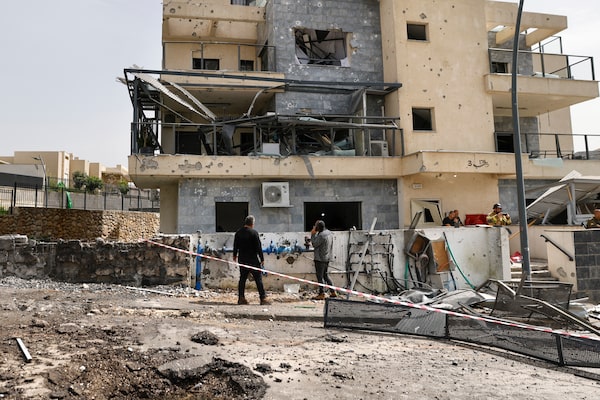 Israeli forces check the site that was hit by a Hezbollah rocket in Kiryat Shmona, in northern Israel, on March 27.JALAA MAREY/Getty Images