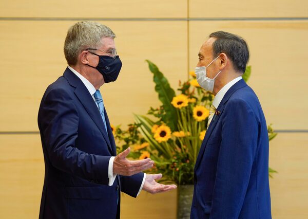 Japanese Prime Minister Yoshihide Suga, right, meets with International Olympic Committee president Thomas Bach in Tokyo on July 14.Kimimasa Mayama/Pool via REUTERS