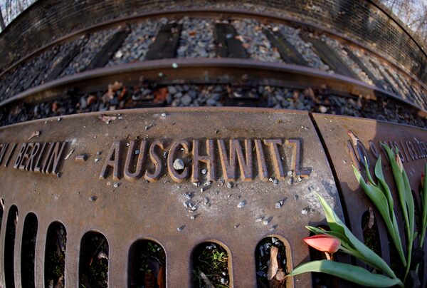 A flower is laid next to the word 'Auschwitz' at the Gleis 17 memorial, a platform at Berlin-Grunewald train station from where Jewish citizens were deported by train to the Nazi concentration camps between 1941 and 1945, in Berlin, on Jan. 27, 2021.FABRIZIO BENSCH/Reuters