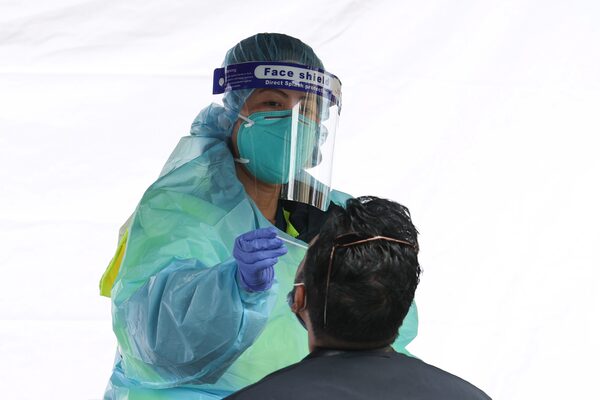 A medical worker administers a COVID-19 test at a pop-up centre in Sydney, Australia, on Aug. 12, 2020.LOREN ELLIOTT/Reuters