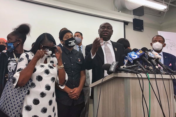 In this Sept. 22, 2020, file photo, attorney Benjamin Crump, at podium, speaks alongside members of Dijon Kizzee's family during a news conference in Los Angeles.Stefanie Dazio/The Associated Press