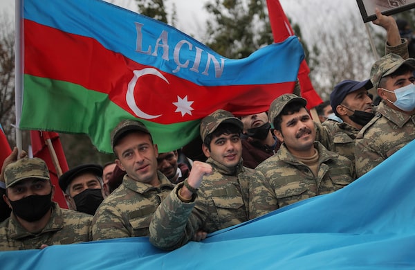 Azerbaijani soldiers celebrate the transfer of the Lachin region to Azerbaijan's control, in Aghjabadi, Azerbaijan, on Dec. 1, 2020.Emrah Gurel/The Associated Press