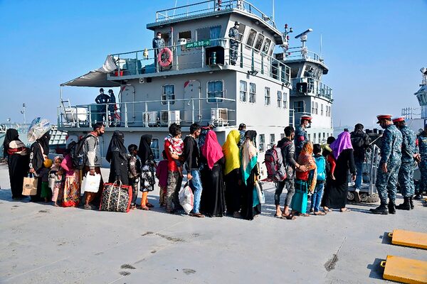 Rohingya refugees prepare to board a Navy ship as Bangladesh relocates them to Bhashan Char Island in the Bay of Bengal, on Jan. 29, 2021.-/AFP/Getty Images