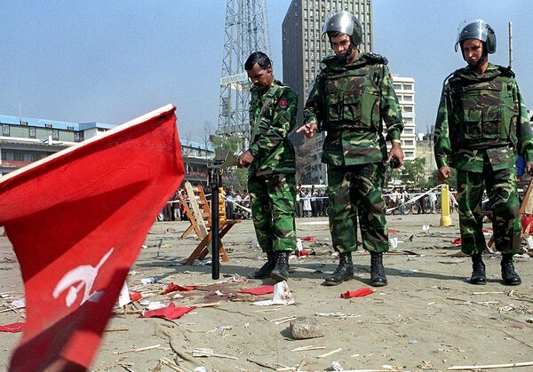 In this file photo taken on Jan. 21, 2001, members of the Bangladesh Army inspect the scene of an explosion that took place at a Bangladesh Communist Party rally.JEWEL SAMAD/AFP/Getty Images