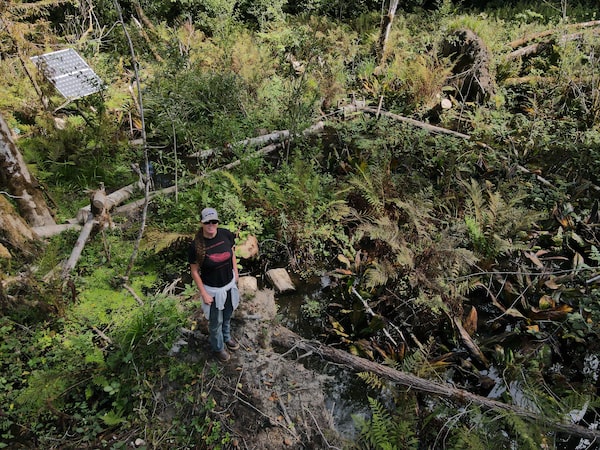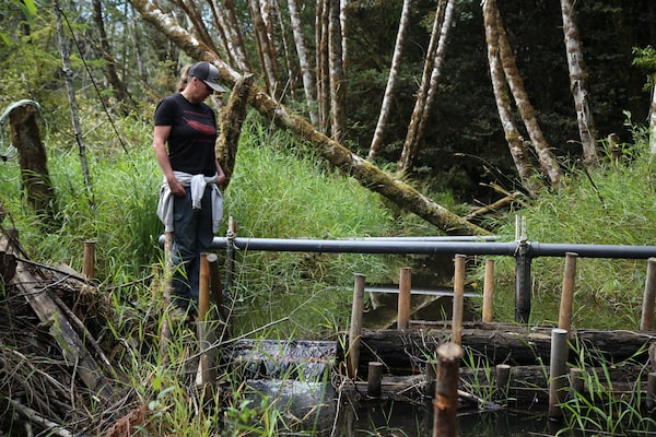 Sarah Beesley, a fisheries biologist with the Yurok Tribe in northern California, examines artificial beaver dams created on McGarvey Creek on Sept. 12.Nathan VanderKlippe/The Globe and Mail