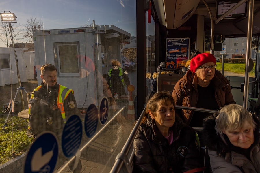 The officers made their way slowly down the aisle, taking photos of each passenger’s document. Michal and Olga Siecinski sat tensely in a seat near the back door. They’re refugees from Ukraine who live in Frankfurt and cross over to Slubice regularly. Mr. Siecinski had forgotten his Ukrainian passport at home. All he had was a temporary visa issued by the German government. It wasn’t good enough, the officer said. The couple pleaded until he finally relented. “Next time bring your passport,” he said sternly.