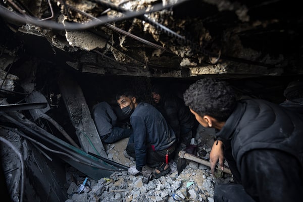Palestinians search for bodies and survivors in the rubble of a residential building destroyed in an Israeli airstrike, in Rafah, southern Gaza Strip, on Dec. 15.Fatima Shbair/The Associated Press